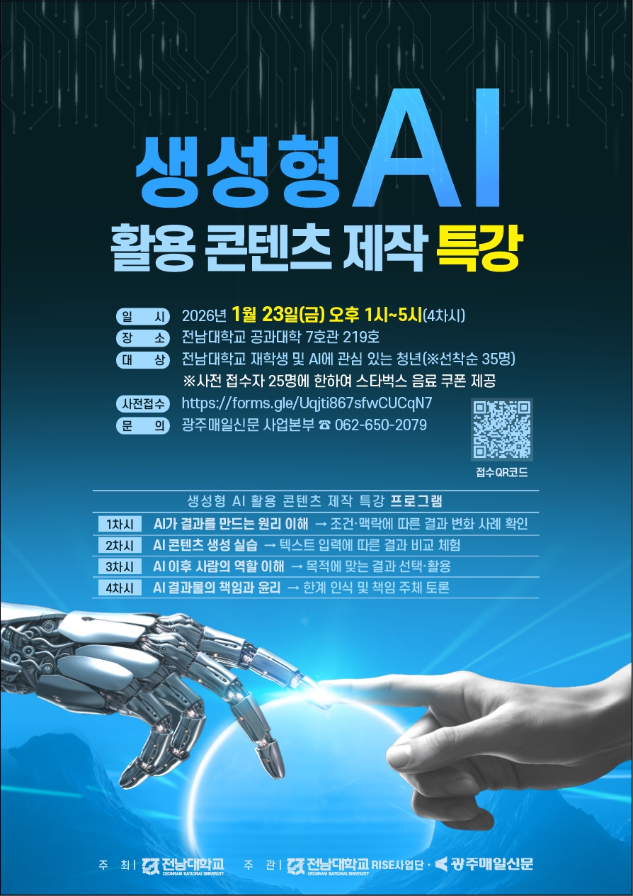 fnctId=bbs,fnctNo=993 글번호 946279 [2026.1.23.(금) 13:00~17:00] 생성형 AI 활용 콘텐트 제작 특강(선착순 모집) 작성일 2026.01.20 수정일 2026.01.20 작성자 조은혜 조회수 937 첨부파일 첨부파일이(가) 없습니다.